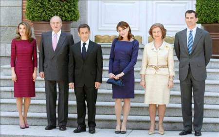 En las siguientes fotografías se puede observar a los Reyes y los Príncipes de Asturias junto con el Presidente y su esposa a las afueras del Palacio de Zarzuela, el día de mañana Sarkozy acudirá a la celebración de la cumbre anual Hispano-Francesa en la que se pretende reforzar aspectos bilaterales entre ellos la lucha contra el terrorismo y algunos otros de aspecto económicos y políticos.